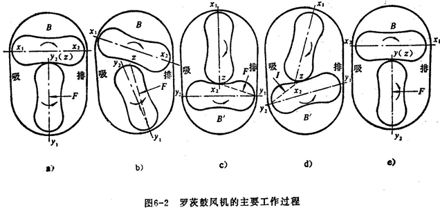 羅茨鼓風(fēng)機(jī)系屬容積回轉(zhuǎn)鼓風(fēng)機(jī),其按轉(zhuǎn)子的形狀可分為兩葉型和三葉型。三葉型轉(zhuǎn)子每轉(zhuǎn)動(dòng)一次由 兩 個(gè)轉(zhuǎn)子進(jìn)行三 次吸、排氣。與二葉型相比,氣體脈動(dòng)性小,振動(dòng)也小,噪聲低.不問主要介紹一下二葉羅茨風(fēng)機(jī)的工作原理。
